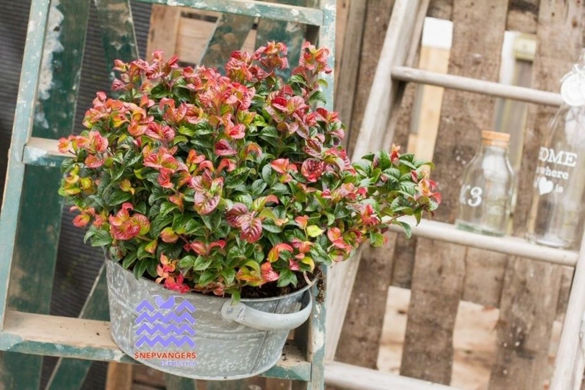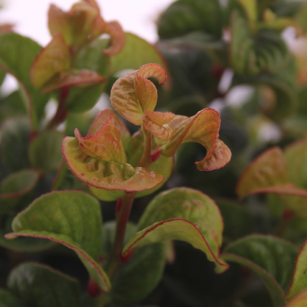 Virginsk vinterrosling 'Curly Red'. En städsegrön buske med krulliga, glänsande blad som börjar röda, blir gröna och får röd-lila färg på hösten. Trivs i sol eller halvskugga och sur jord. Lämplig för trädgård och kruka, blommar vitt i maj.