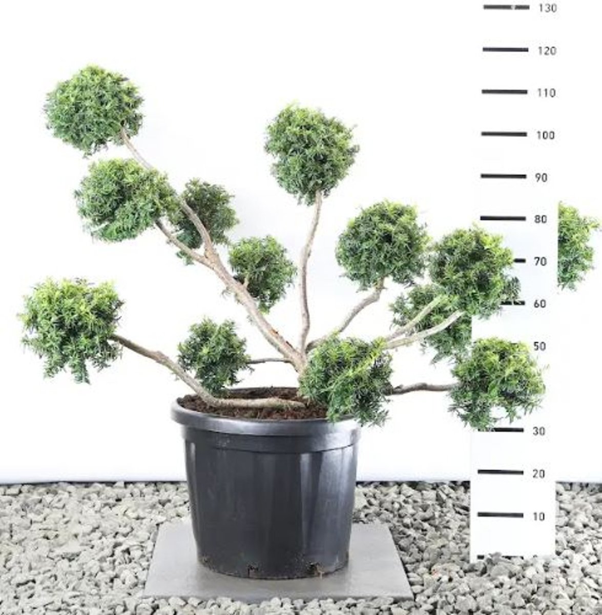 Vintergrön barrväxt med ett kompakt, platt spretande växtsätt. Växer långsamt. Höjd, upp till 60 cm. Bredd drygt 1,5 m. Gulgrönfläckiga barr. För näringsrik, inte alltför våt jord. Klarar lätt skugga.