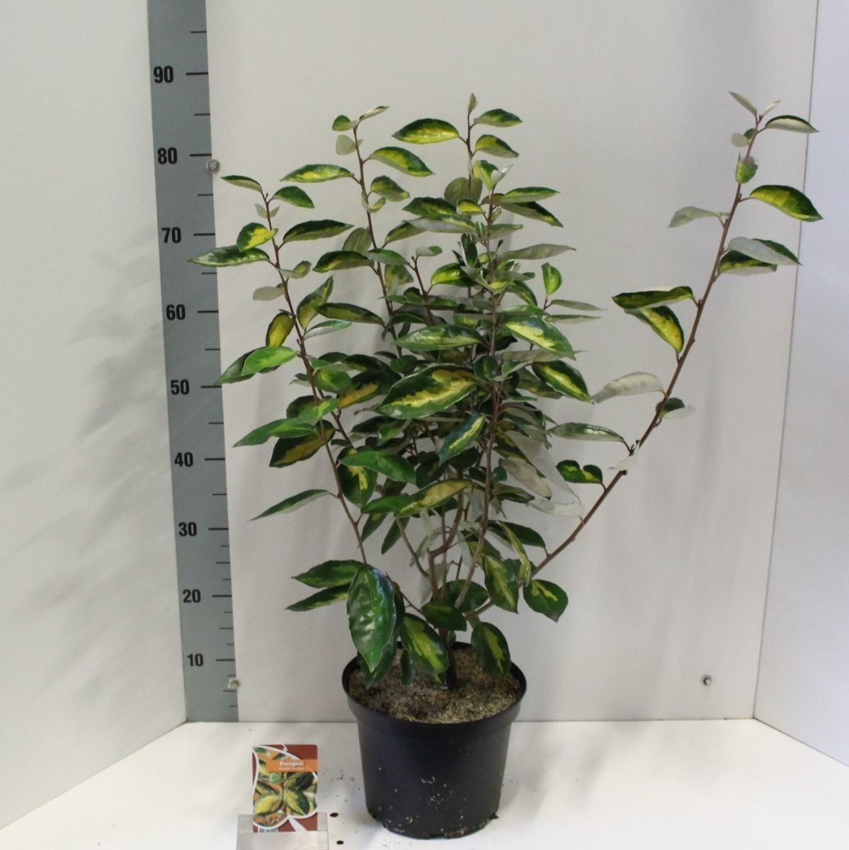 Högväxande vintergrön buske. Höjd cirka 2 - 3 m. Tål beskärning mycket väl. Grågröna blad med guldgula fläckar, gråvit undersida. Doftande, små vita blommor på sensommaren. Solig, skyddad växtplats.