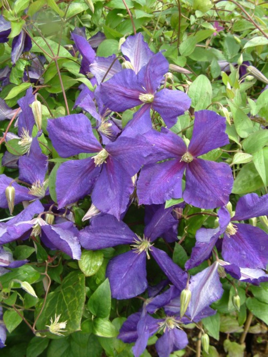 Bladfällande klätterväxt som blir upp till 2 - 3 meter hög. Måttligt överhängande blommor, 10 cm i diameter. Sammetslikt mörklila. Blommar överdådigt. Juni - september. Beskär eventuellt efter vintern. Solig växtplats. Näringsrik jord.