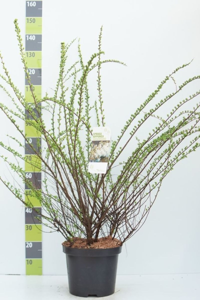 Upp till 1,5 m hög buske. Överhängande kvistar. Smala mörkgröna blad. Bladfällande. Klarvita blommor i små flockar. Blommar rikligt. Maj - juni. Skär varje år bort några gamla kvistar. Alla jordtyper. Sol.