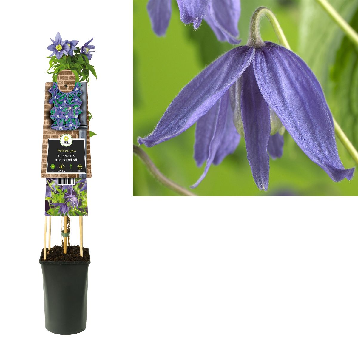 Höjd 2-3 m. Ljusblå fyllda klockor, 6-7 cm. Blommar i maj-juni. Sol-halvskugga. Väldränerad jord. Lämlig på spaljéer, i träd och buskar. Beskäres vid behov direkt efter blomning. Zon 1-5.