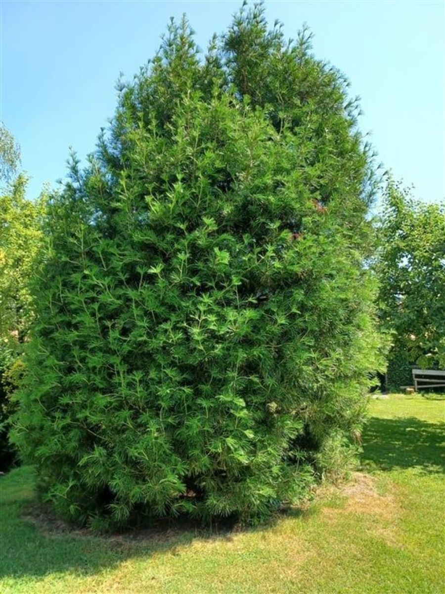 Kraftigt uppåtväxande barrträd. Först pelarformig, senare smalt pyramidformig. Växer långsamt. Höjd cirka 7 m. Långa, glänsande gröna barr. Kräver näringsrik, inte alltför torr jord. Sol - halvskugga.