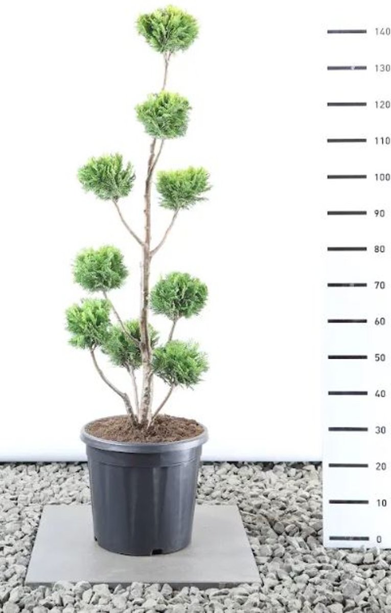 Bred, pyramidformigt växande barrväxt. Höjd cirka 3 - 4 m, bredd cirka 1,5 m. Kompakt växtsätt. Svavelgula barr. Tål beskärning bra, används som häckväxt. Ljus växtplats. Humusrik jordart.