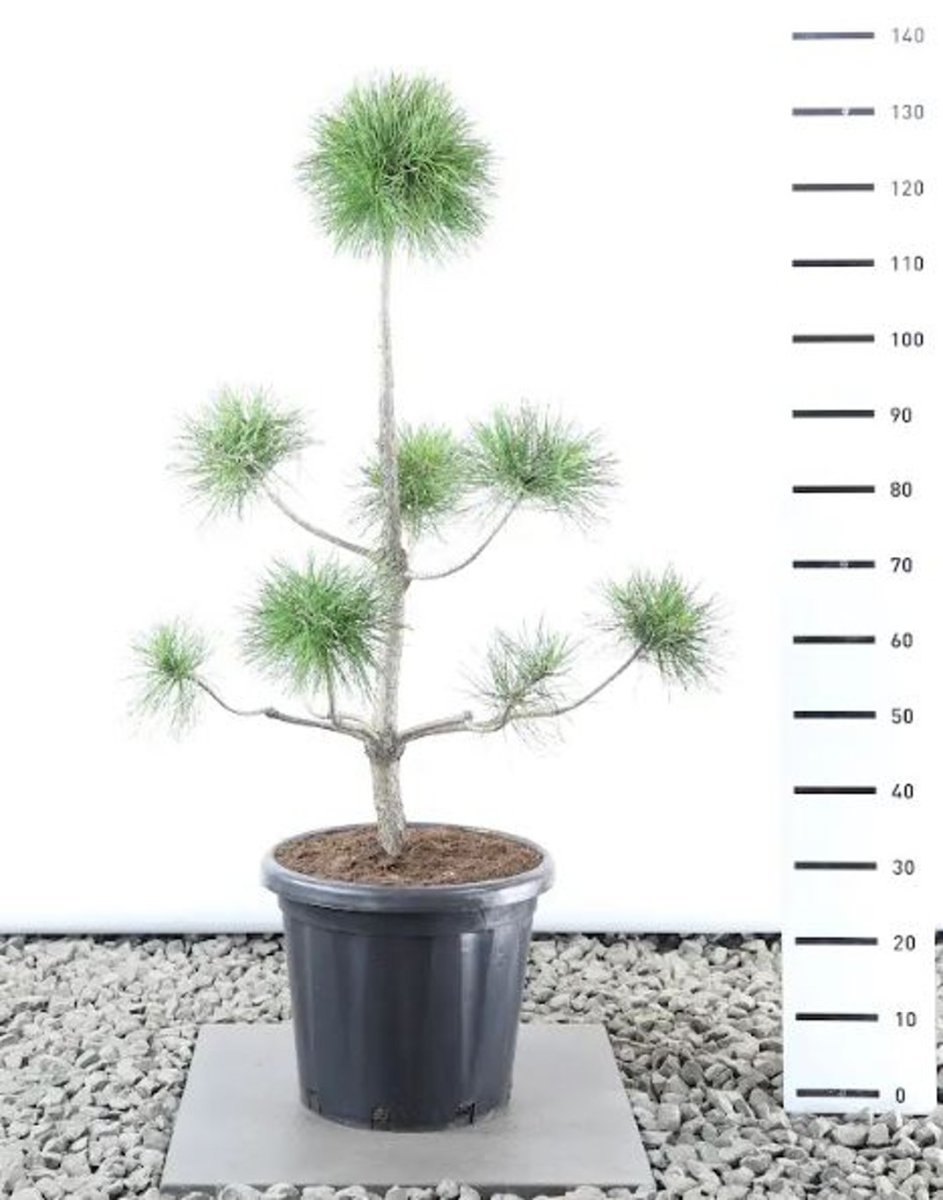 Kraftigt uppåtväxande barrträd. Först pyramidformigt, senare blir kronans form mer eller mindre parasollformig och öppen. Höjd cirka 10 m. Långa, mörkgröna barr, något vridna. Hängande kottar. Lämplig för torr jord.