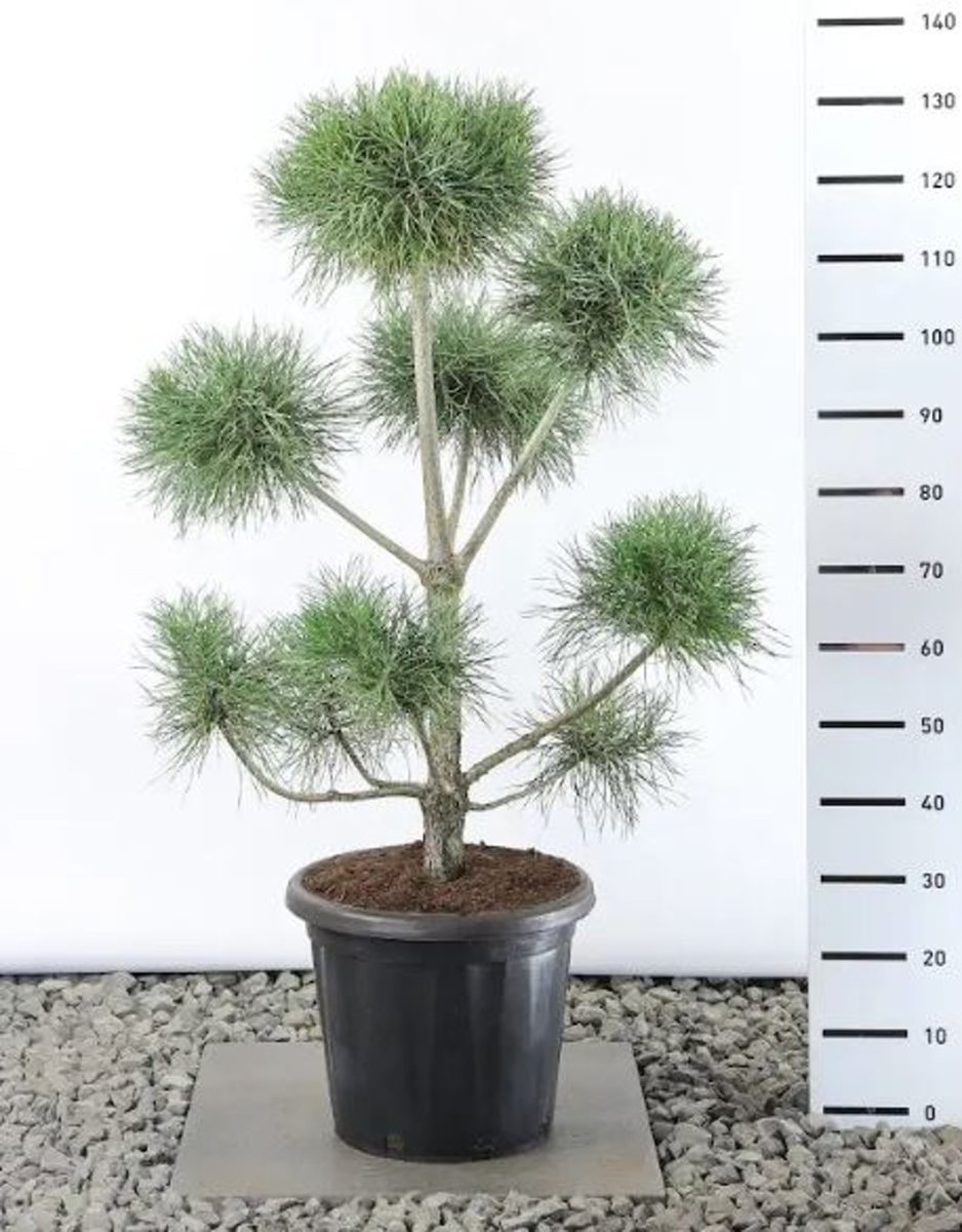 Kraftigt uppåtväxande barrträd. Först pyramidformigt, senare blir kronans form mer eller mindre parasollformig och öppen. Höjd cirka 10 m. Långa, mörkgröna barr, något vridna. Hängande kottar. Lämplig för torr jord.