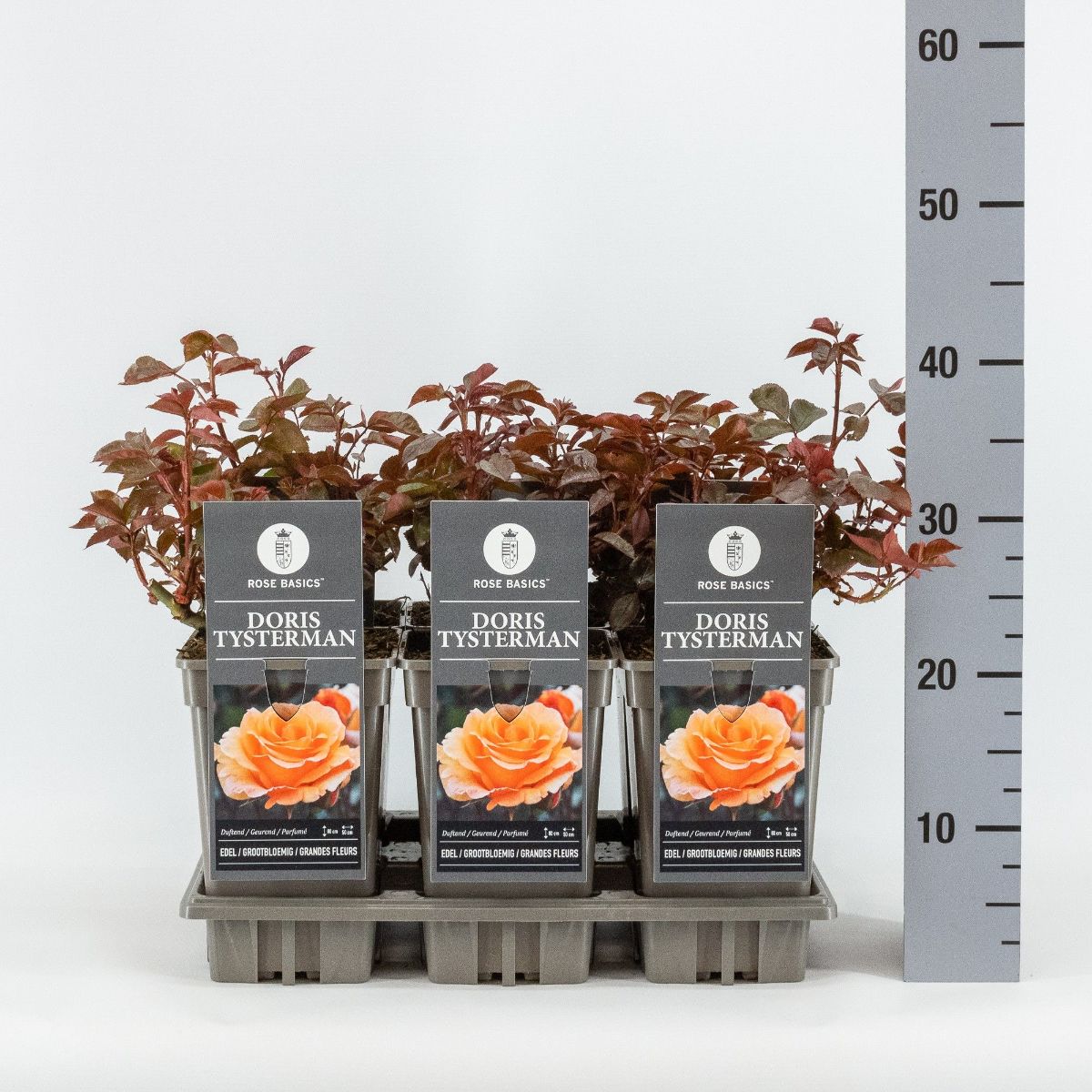 Ros som blommar rikligt och länge. Stora, dubbla kopparorangefärgade blommor på styva stjälkar. Huvudblomning juni - juli. Beskärning efter huvudblomningen ger efterblomning in i oktober. Solig växtplats. Höjd cirka 90 cm.