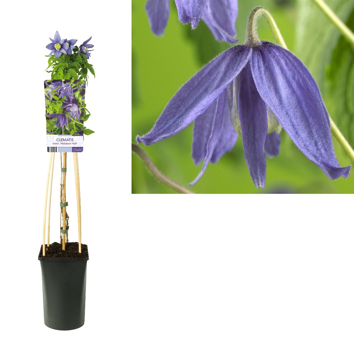 Höjd 2-3 m. Ljusblå fyllda klockor, 6-7 cm. Blommar i maj-juni. Sol-halvskugga. Väldränerad jord. Lämlig på spaljéer, i träd och buskar. Beskäres vid behov direkt efter blomning. Zon 1-5.
