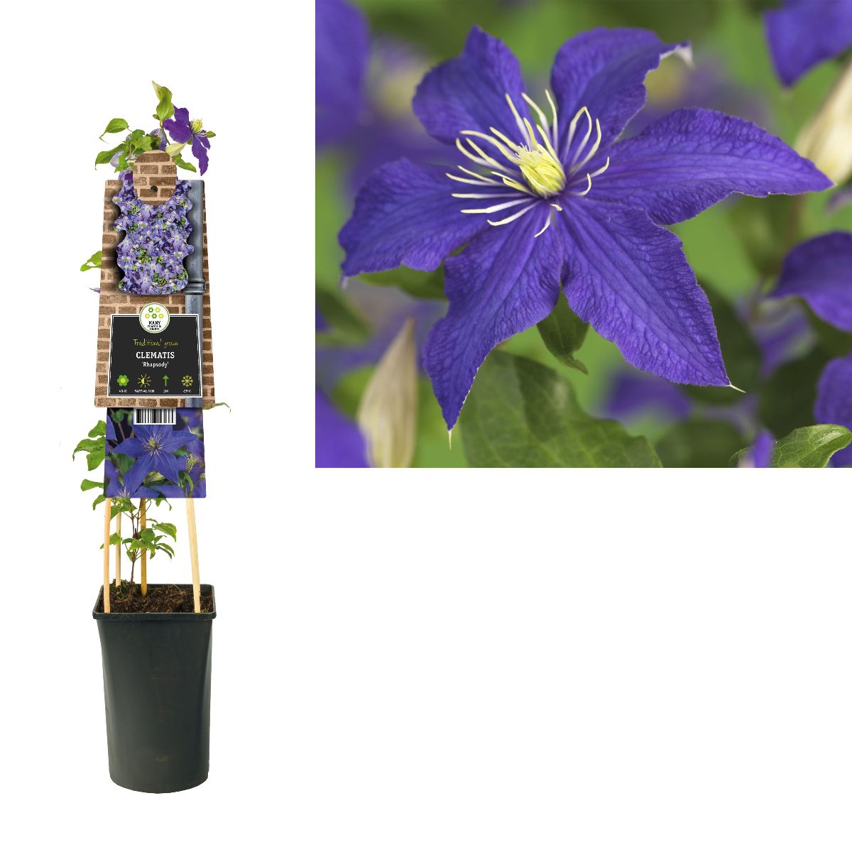 Klängväxt. Stora, intensivt blå blommor i juni-juli samt remonterar i augusti-september. Sol-halvskugga. Djup, väldränerad, näringsrik jord. Planteras i kruka eller låt klänga i spaljé, mindre träd. Höjd 2-3 m. Zon 1-4.